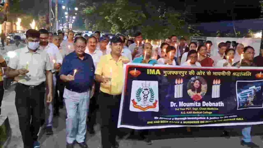 मुजफ्फरपुर :- पिछले दिनों कोलकाता में हुई मानवता को शर्मसार करने वाली घटना को लेकर सरकार से करवाई और चिकित्सक को पूरी सुरक्षा पर नीति बनाए जाने की मांग को लेकर मुजफ्फर में देर शाम IMA के बैनर तले डॉक्टरों ने कैंडल मार्च निकालकर शांतिपूर्ण विरोध प्रदर्शन किया ।सैकड़ो की संख्या में महिला और पुरुष चिकित्सक द्वारा निकाला गया था यह मार्च ।
