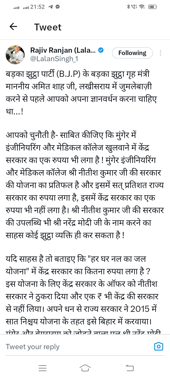 यदि साहस है तो बताइए कि “हर घर नल का जल योजना” में केंद्र सरकार का कितना रुपया लगा है ? इस योजना के लिए केंद्र सरकार के ऑफर को नीतीश सरकार ने ठुकरा दिया और एक ₹ भी केंद्र की सरकार से नहीं लिया। अपने धन से राज्य सरकार ने 2015 में सात निश्चय योजना के तहत इसे बिहार में करवाया। मुंगेर और बेगूसराय को जोड़ने वाला पुल श्री नरेंद्र मोदी सरकार की नहीं बल्कि श्रद्धेय अटल जी की सरकार की देन है। फुलवामा में सीआरपाएफ़ के 40 जवानों की शहादत पर जम्मू-कश्मीर के तत्कालीन लेफ़्टिनेंट गवर्नर श्री सत्यपाल मल्लिक जी के खुलासे पर आप मौन क्यों हैं ?
